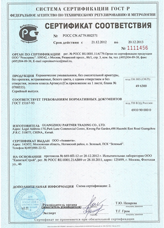 Сертификат на керамические умывальники